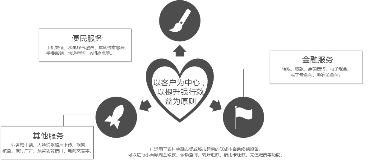 為幫助解決銀行業(yè)面臨的互聯網金融、金融脫媒、利率市場化、行業(yè)競爭加劇、成本高、盈利下降等挑戰(zhàn),同時響應國家助農政策號召。 我司研發(fā)一款專門針對農村金融市場或商超等特定場景而開發(fā)的可以查詢,轉賬,取現,收單、信用卡還款,手機話費充值等,同時可疊加本地特色業(yè)務(水、電、煤代繳、助農補貼、社保等)的柜立式金融便民終端。終端可解決銀行ATM機網點固定、單一且投放量不足的問題。整機總體高度約140cm,外觀設計符合人體工程學,操作舒適